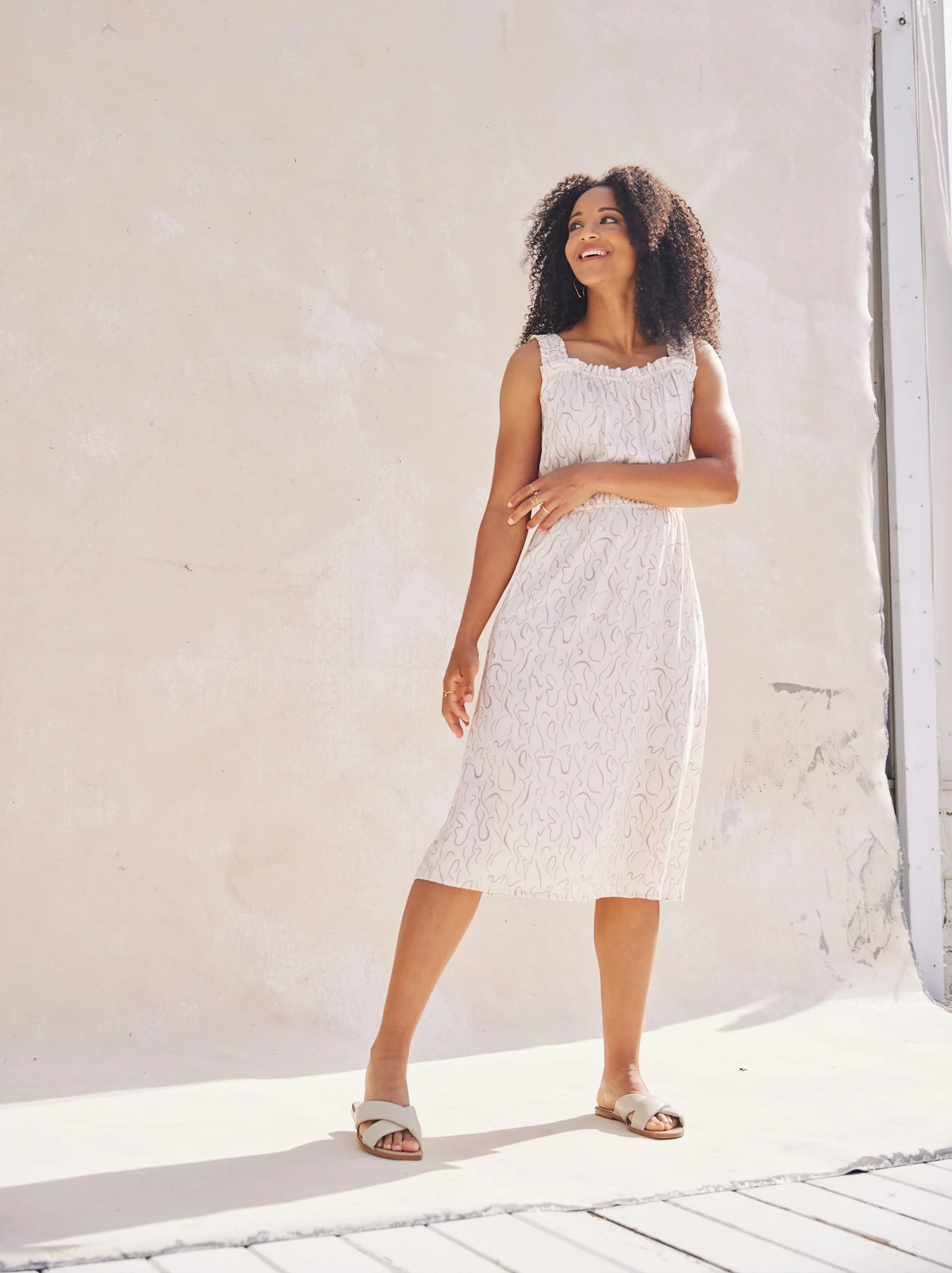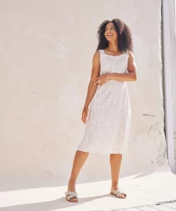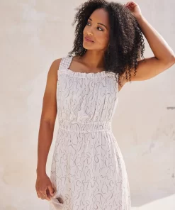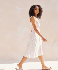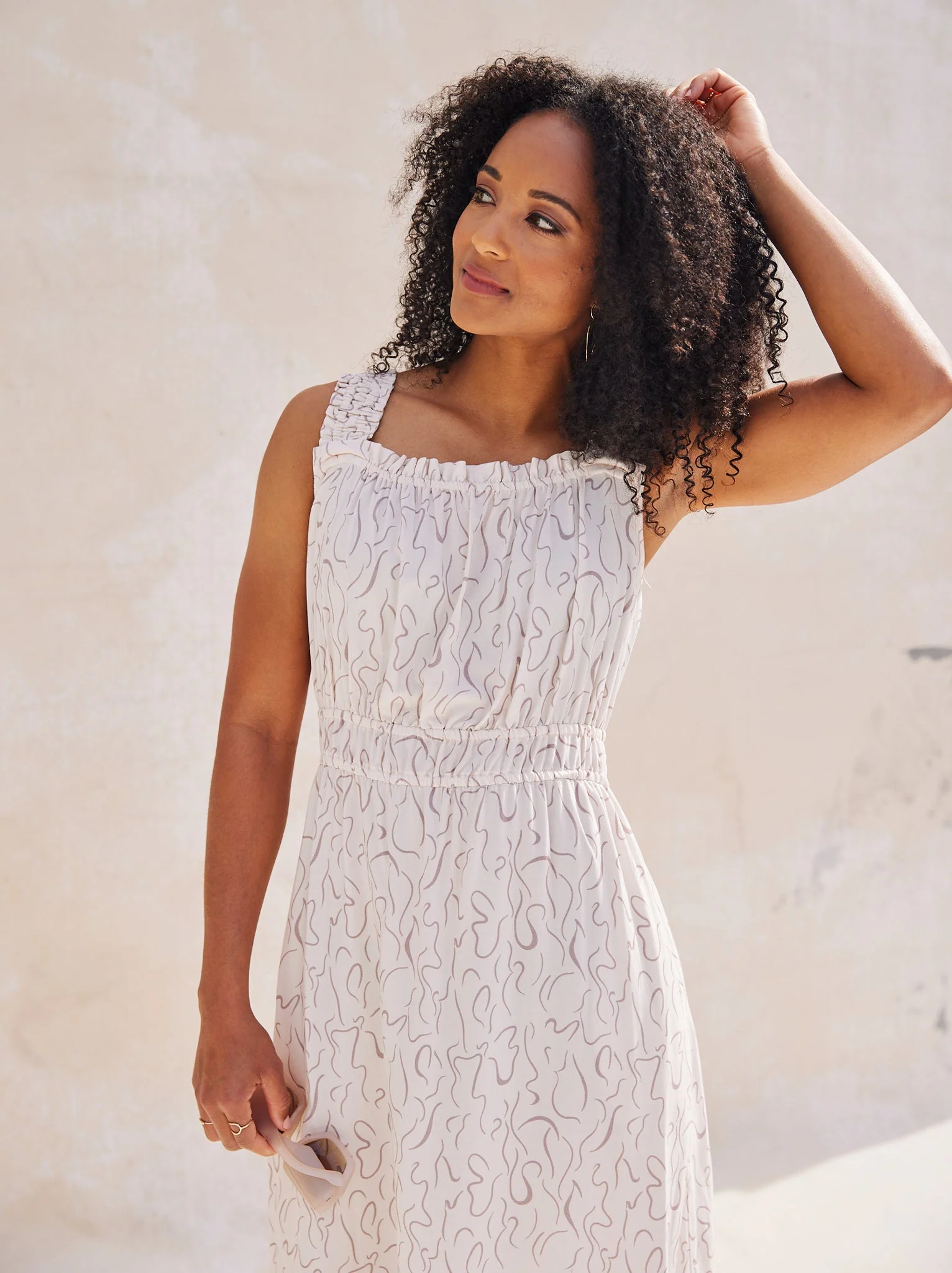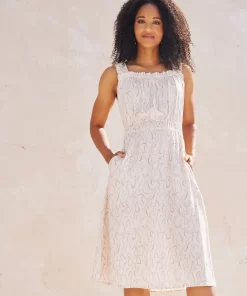Made in our super soft viscose, The Molly features an apron style neckline with ruffle detail and tank sleeves. It fits easy through the bodice, with an elastic waistline that flows into a relaxed midi length skirt with side seam pockets.